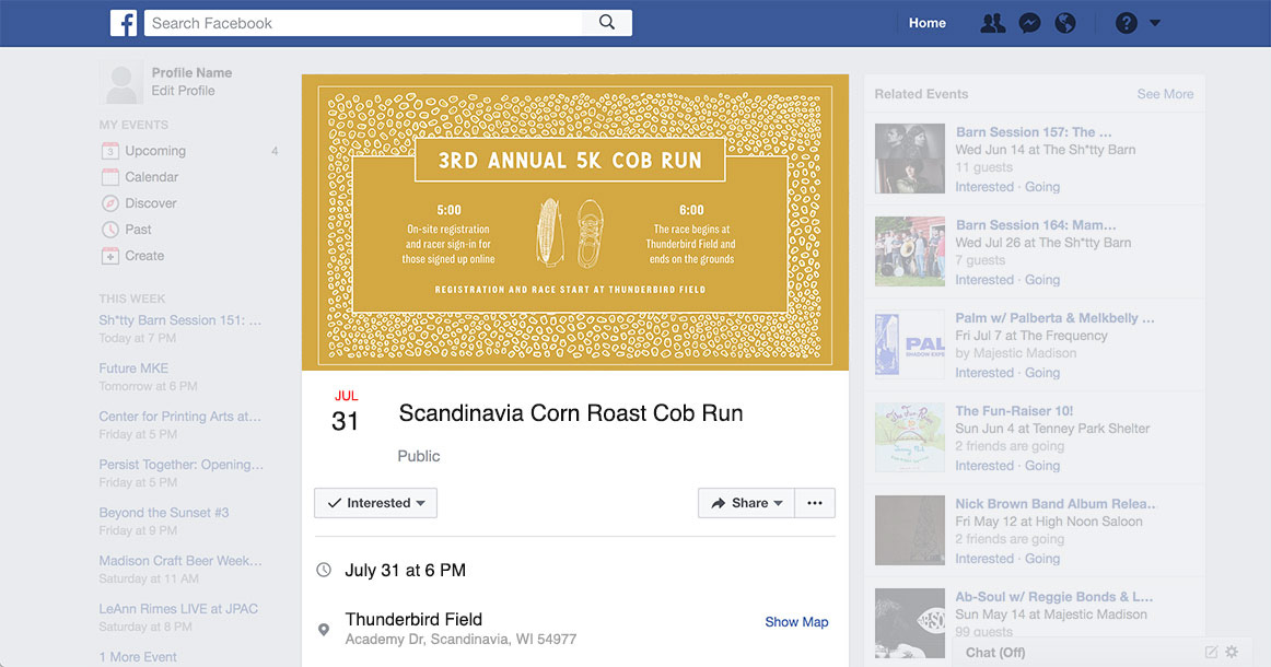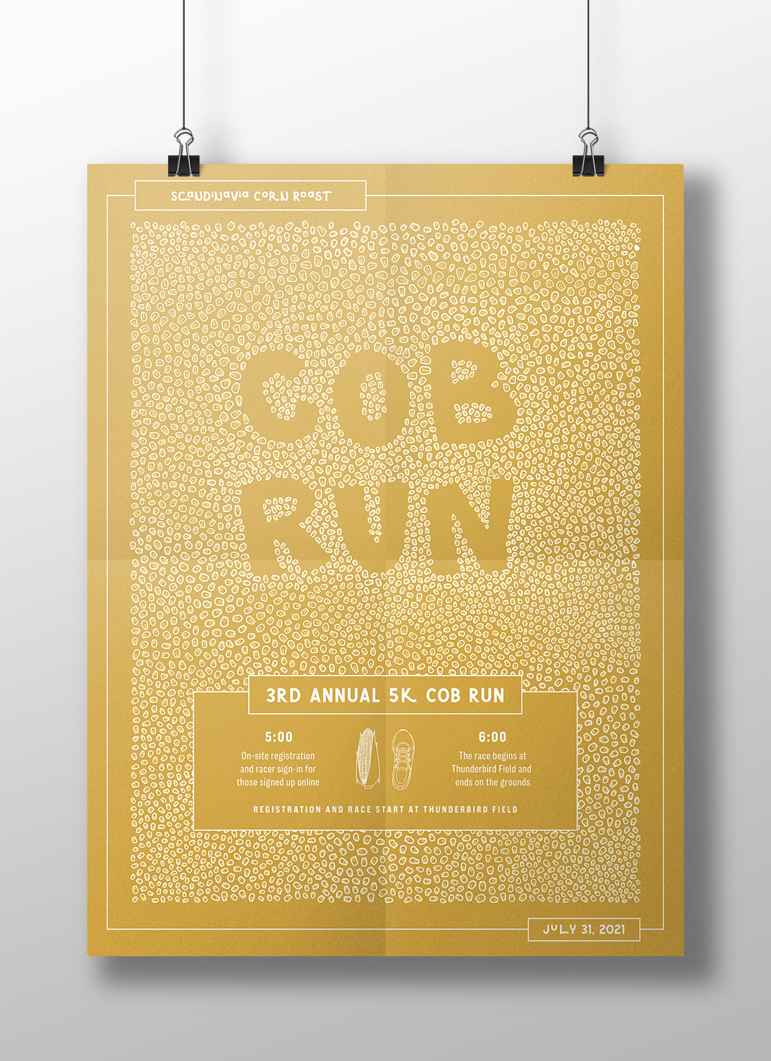 Every year athletes and non-athletes alike embark on the Scandinavia Corn Roast Cob Run. I illustrated a field full of corn kernels, along with ear and shoe icons to give this 5k promo poster a modern, playful look.